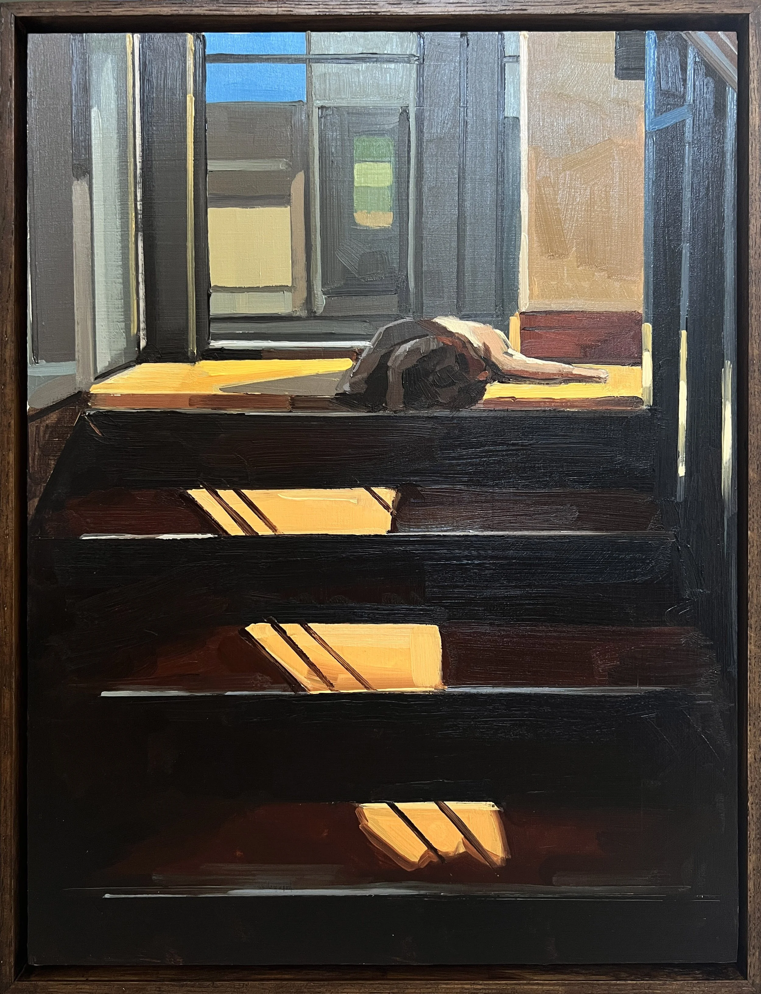 Lottie At The Top Of The Stairs, 16x12", 2025.